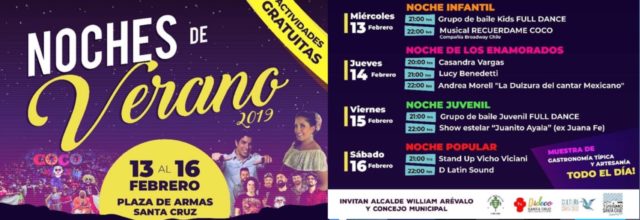 Con el fin de potenciar a nuestros artistas locales y generar espacios de esparcimiento, en torno a la música nacional, gastronomía y artesanía, el alcalde de Santa Cruz, William Arévalo junto al Concejo Municipal, te invitan a disfrutar junto a tu familia y amigos de las “Noches de Verano 2019”, este miércoles 13 al sábado 16 de febrero en la Plaza de Armas de la comuna, a partir de las 21:00 hrs.