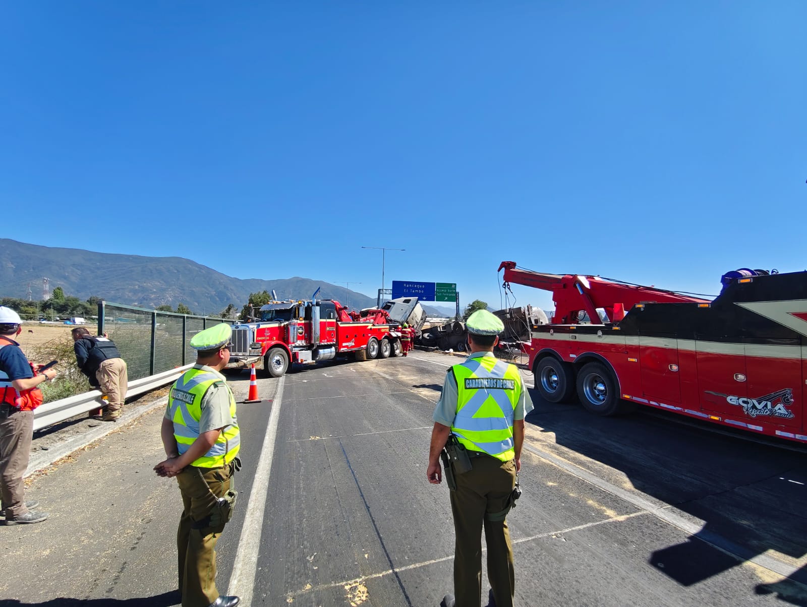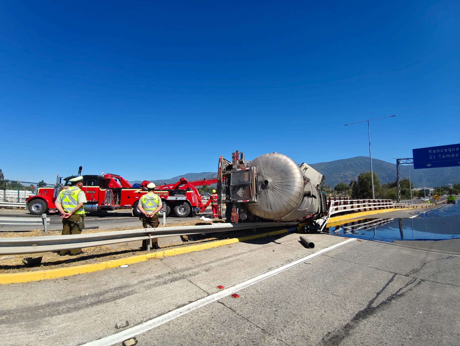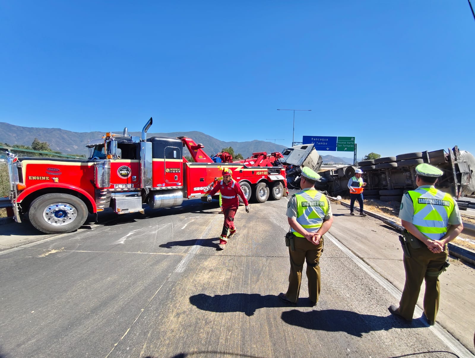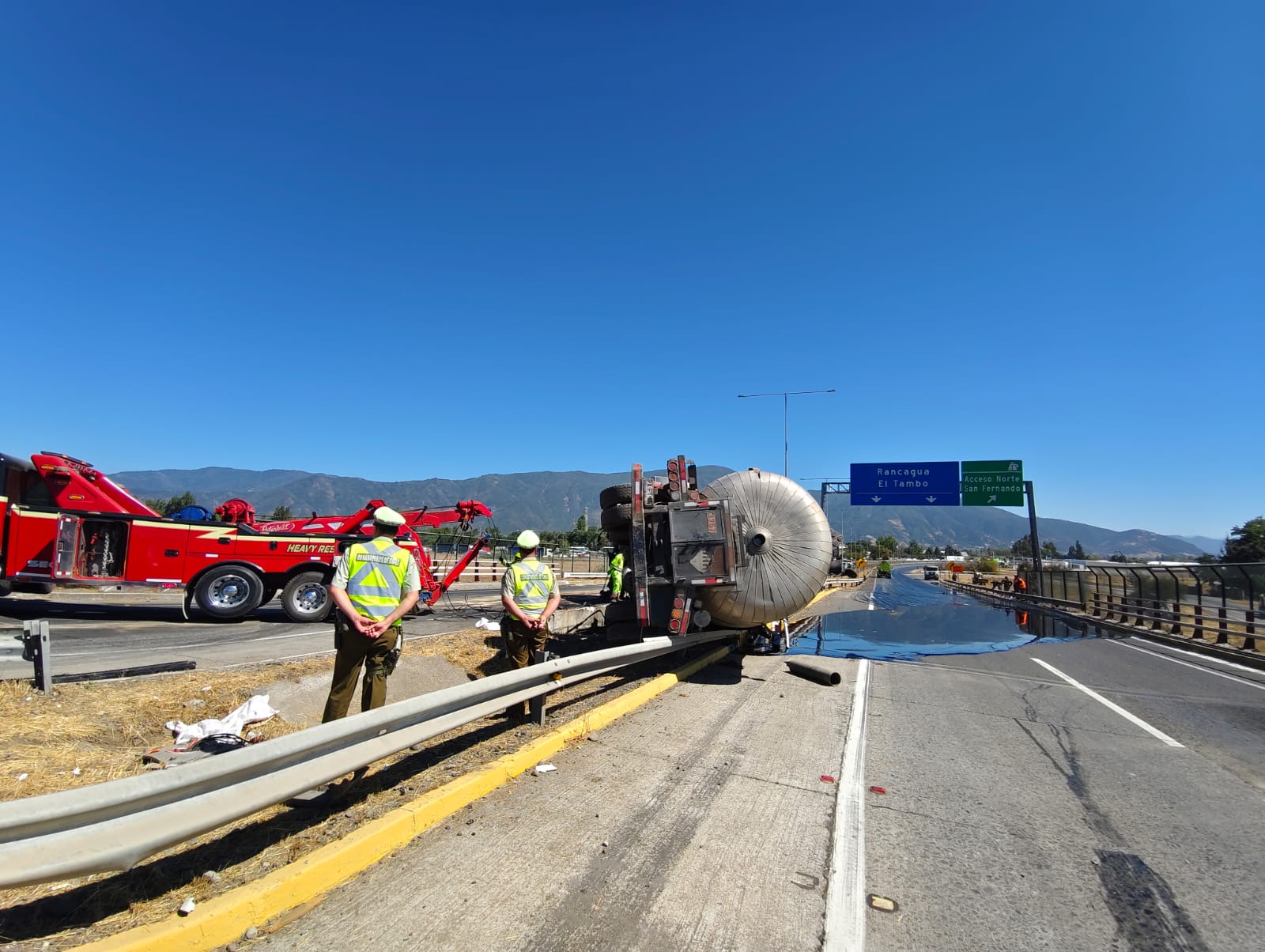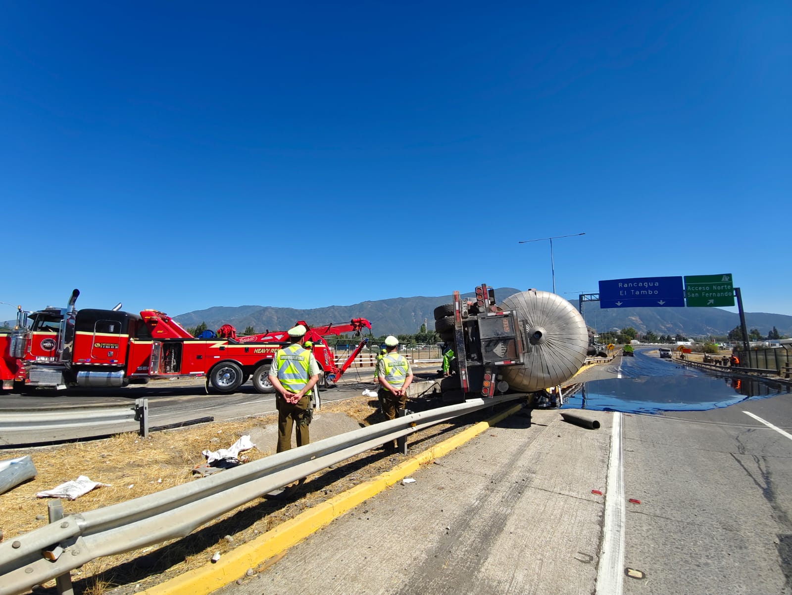 El hecho involucró a un camión que transportaba asfalto líquido y que, por causas que se investigan, perdió el control, volcándose sobre la calzada y quedando en suspensión sobre el paso superior, entre ambas pistas de la Ruta 5 Sur.